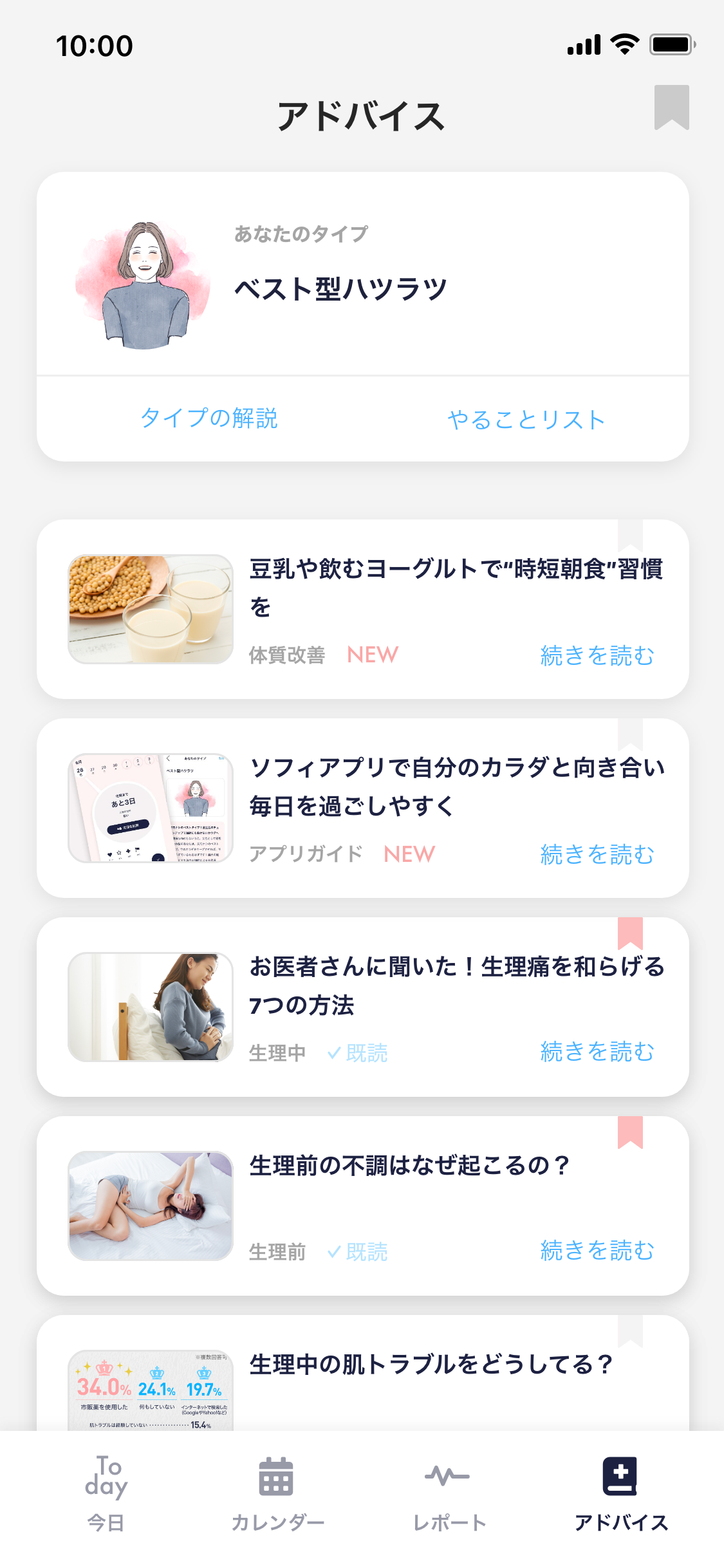 月経痛やPMSは、仕方ないこととして、放っておいていないですか?婦人科を受診するのは、とてもハードルが高いことですね。まずは、自分の体を知ることから始めてみてください。自分の月経周期は正常なのか?体調の良い時と悪い時の違いは?食生活や運動習慣の改善で、あなたの生活がより快適になるかもしれません。自分の体を知り、正しい医療情報と照らし合わせ、その対処方法を考えてみましょう。今回のアプリでは、一人一人それぞれの体質に合わせたアドバイスができるよう工夫されています。体調や生理の状態を記録することにより、自分の体質タイプがわかります。さらに改善案も提案されます。もし必要なら婦人科への受診もお勧めします。楽しみながら自分の体と向き合い、健康な体づくりを目指してみてください。全ての女性が、健康で楽しく暮らせるよう願っています。