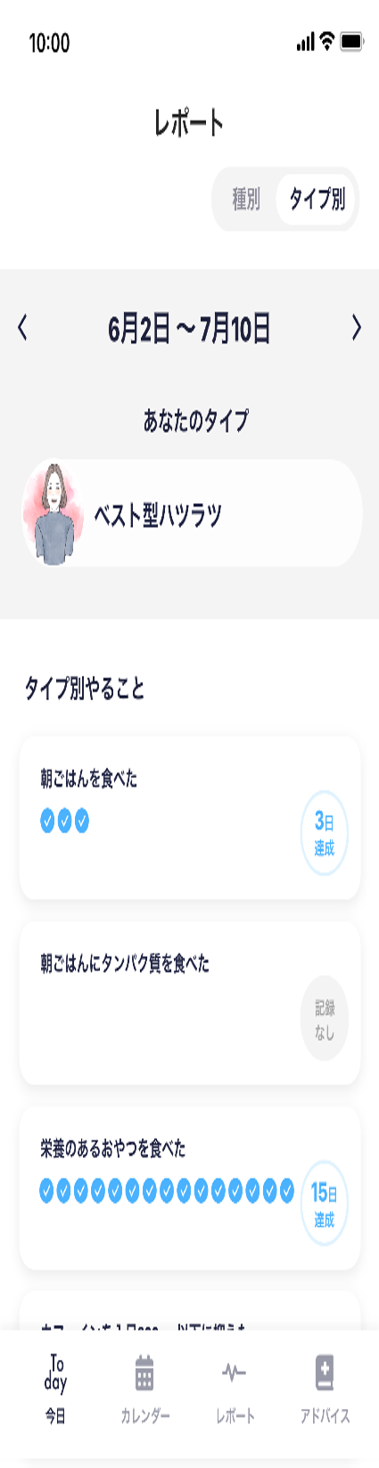 - やることを継続して実施し、体調と共に記録することで、体質タイプの改善をサポートします。