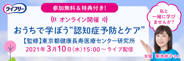 ユニ・チャーム株式会社(本社:東京都港区、代表取締役 社長執行役員:高原豪久)は、コロナ禍で外出を控えることが多いなか、高齢者の認知症リスクが高まる可能性に対し、今から取り組める『おうちで学ぼう‟認知症予防とケア”』オンライン講座を、2021年3月10日に開催しましたのでお知らせします。