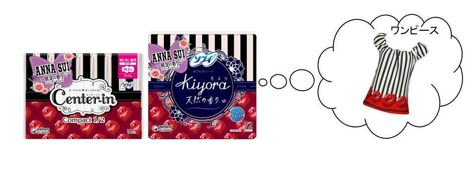 そこでこの度、世界中にファンを持ち、アパレルからコスメまで幅広いカテゴリーを展開している「ANNA SUI」とコラボレーションをしました。生理用ナプキンに加え、毎日の清潔ケアも出来る『ソフィ®Kiyora』のパンティライナーまでの生理ケア商品のコラボレーション商品を限定発売します。