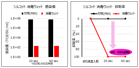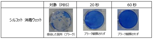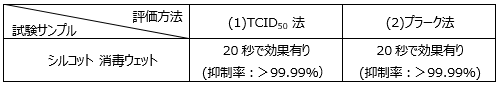 以下の表でも示す通り、2つの評価方法((1)TCID50法と(2)プラーク法)で、『シルコット 消毒ウェット』において、新型コロナウイルスに対して抑制効果を認め、20秒の混和処理で99.99%以上の抑制率を示した。