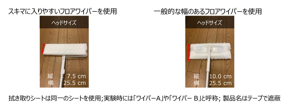 比較対象:幅が狭くてスキマに入りやすいフロアワイパーと一般的な幅のフロアワイパーを用いたフローリング清掃課題