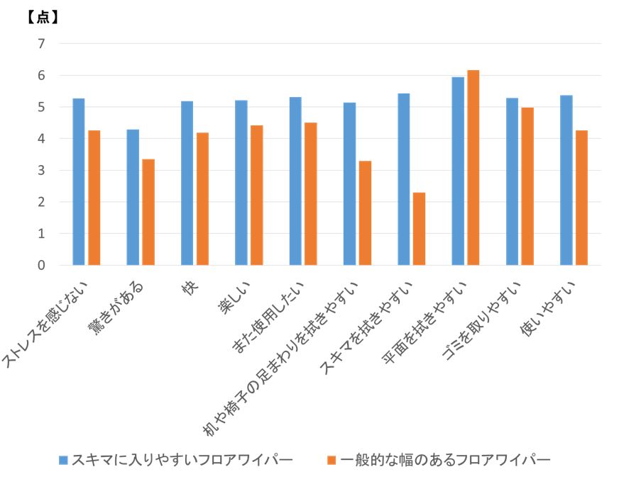 スキマに入りやすいフロアワイパーを使用した場合には、清掃後にポジティブな気分が高くなりました。一方で一般的な幅のあるフロアワイパーを使用した場合には、清掃前後で気分の変化はみられませんでした。使用感の評価では、「平面の拭きやすさ」「ゴミの取りやすさ」を除き、一般的な幅のあるフロアワイパーに比べて、スキマに入りやすいフロアワイパーを使用した場合の方が高く評価されました。具体的には、「ストレスを感じない」「驚きがある」「快適だった」「楽しかった」「また使用したい」「テーブルや椅子の足まわりを拭きやすい」「スキマを拭きやすい」「使いやすい」項目で高く評価されました。