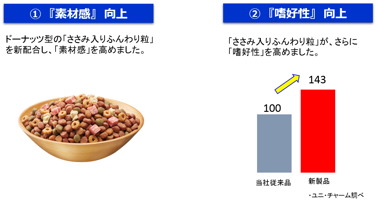 新配合の「ささみ入りふんわり粒」が、“素材感“+”嗜好性“を高めました。