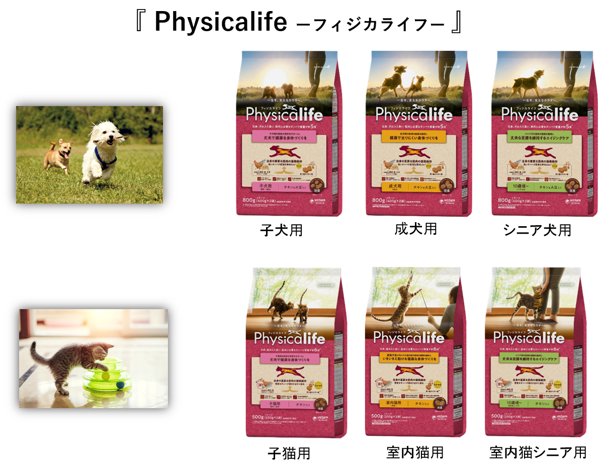 ユニ・チャーム株式会社(代表取締役 社長執行役員:高原豪久)は、子犬・子猫から成犬・成猫、シニア犬・シニア猫になるまで、日々の散歩や遊びの中で、生涯動ける健康なカラダづくりをサポートする、新しいブランド 『Physicalife -フィジカライフ-』を2021年7月21日に全国のペットショップで新発売します。