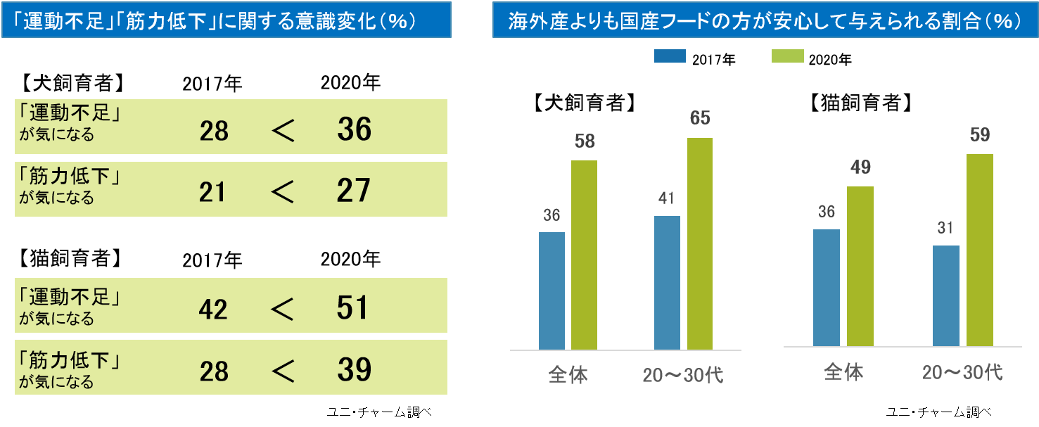 コロナ前より、愛犬愛猫の「運動不足」「筋力低下」といった“健康意識”が拡大しており、コロナ禍でより一層高まることが予測されます。また、愛犬愛猫の健康なカラダづくりには筋肉の発育・筋肉の健康維持が必要であり、その筋肉にはカラダを作る重要な栄養素であるタンパク質がかかせません。