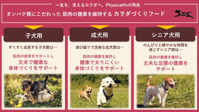 そこで、このたび、ライフステージに合わせた栄養設計でタンパク質にこだわった筋肉の健康を維持するカラダづくりフード『 Physicalife - フィジカライフ - 』を全国のペットショップで新発売します。