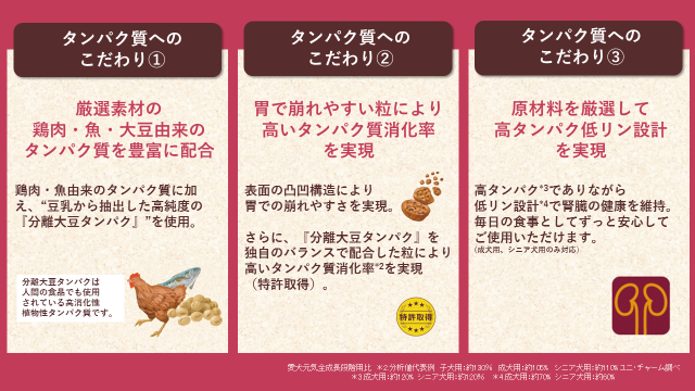タンパク質消化率の高さを証明し、「大豆タンパクを含んだ消化性の高いペットフード」として特許を取得しました。