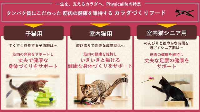 ・筋肉の発育に重要な子猫期から、足腰を維持したいシニア期まで、生涯にわたって健康なカラダづくりをサポートするラインナップで展開します。