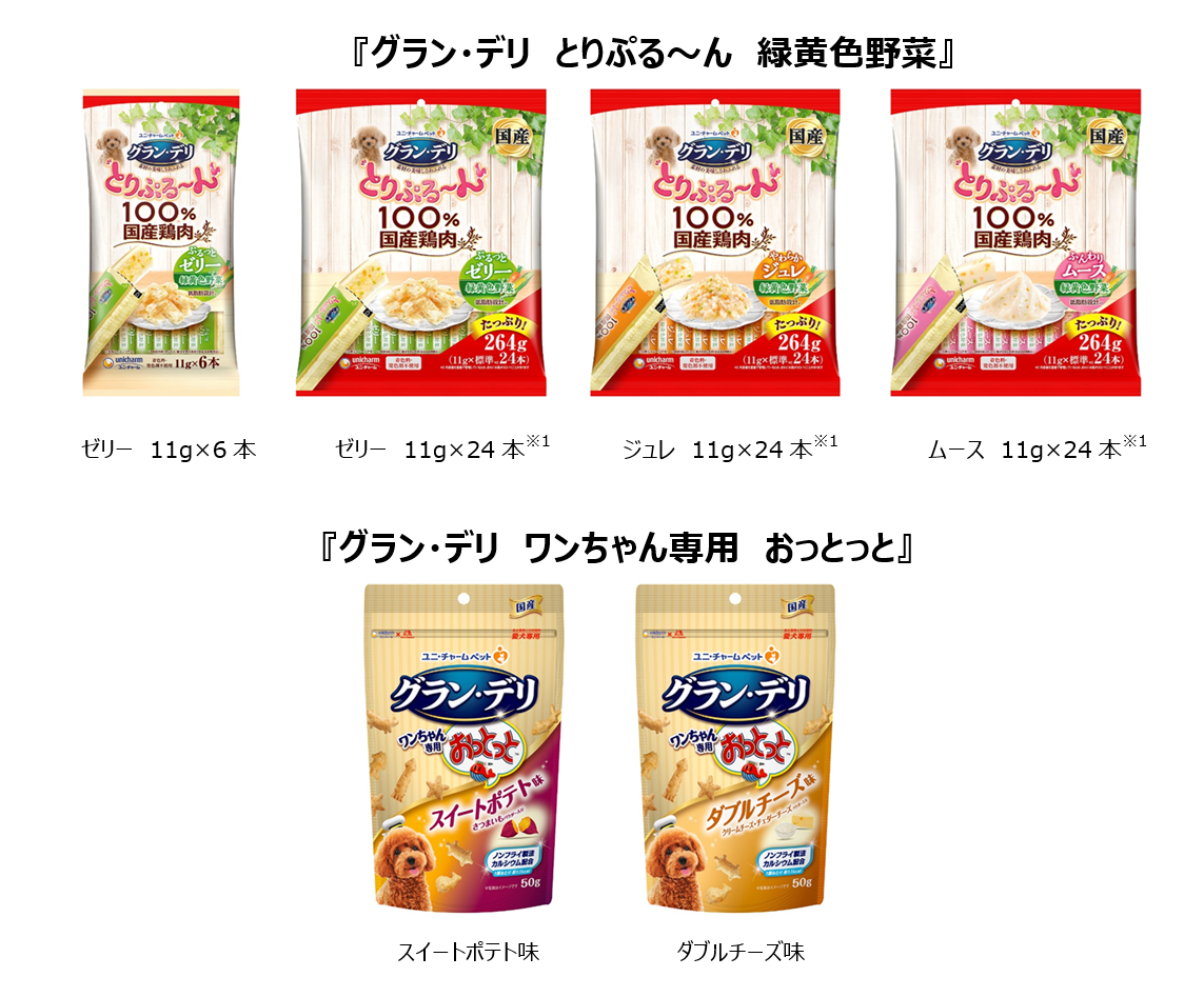 ユニ・チャーム株式会社(代表取締役 社長執行役員 : 高原豪久)は、在宅時間の増加に伴い愛犬におやつをあげる機会が増えていることから、100%国産鶏肉を使用した『グラン・デリ とりぷる~ん』から緑黄色野菜入りの新たなラインナップを、また、粒の形がバラエティに富んでいると話題の『グラン・デリ ワンちゃん専用おっとっと』から人気のフレーバーを2021年9月6日に全国で新発売します。