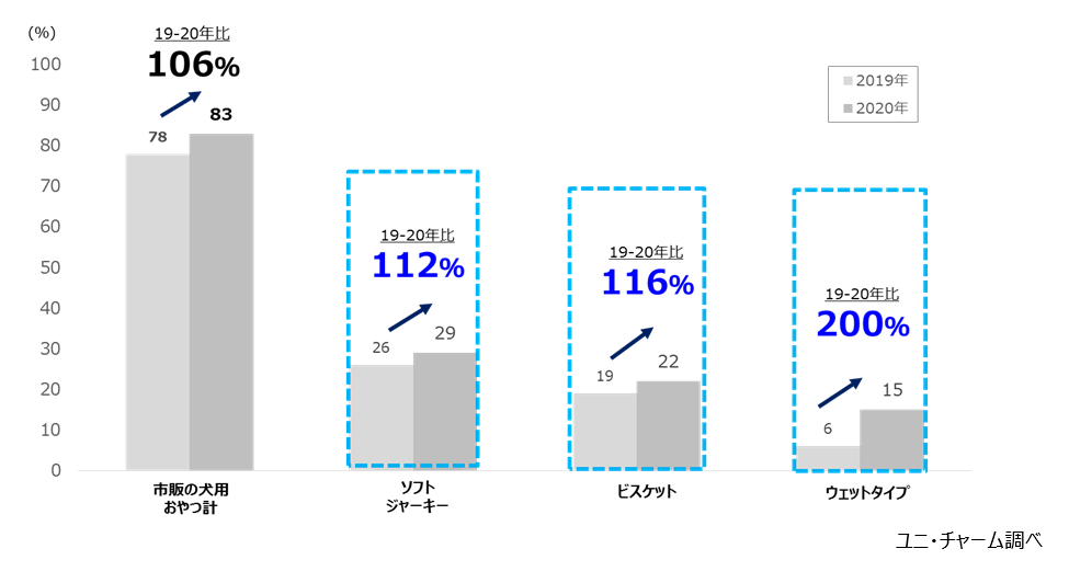 犬用の副食(おやつ)の使用率は年々拡大しており、中でもソフトジャーキーやビスケット、ウェットタイプなど、手軽に与えられるものを求める方が増えています※2。