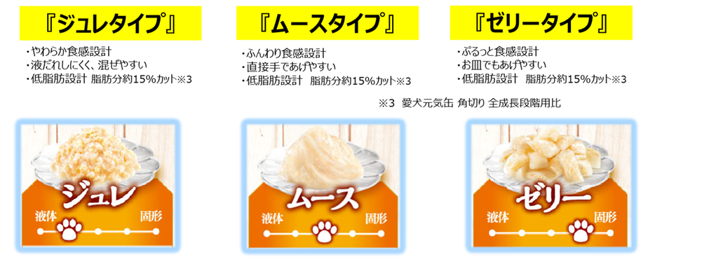 ②ゼリータイプを追加しジュレ・ムース・ゼリーの3つのタイプで、柔らかさ・食感・アレンジも様々