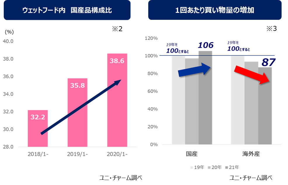 飼い主様の安心志向から“国産品”が重視される傾向にあることから、ウェットフード市場での販売構成比も高まってきており※2、コロナ禍においては1回あたりの買い物量も“国産品”が増加傾向にあります※3。