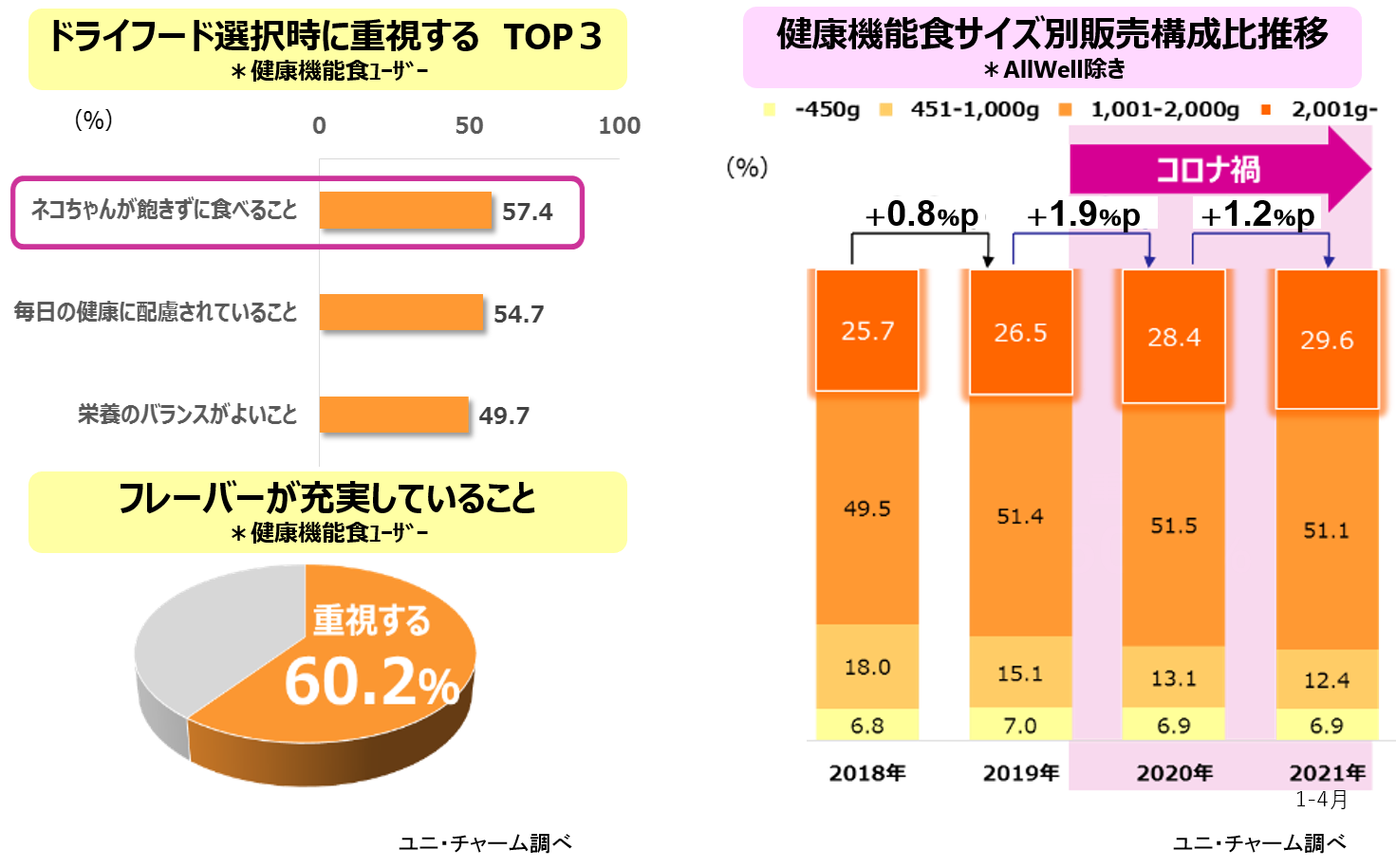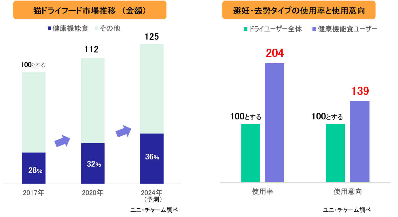 愛猫への健康意識の高まりから、拡大しているドライキャットフード市場における「健康機能食」の構成比が年々増加しています。特に、健康機能食ユーザーの愛猫の避妊・去勢率は高く、避妊・去勢タイプの商品の使用率・使用意向も高い状況にあります。一方で、“食べ悩み”や“味変え”ニーズは高く、フレーバーの充実に関して高い重視度を示しています。