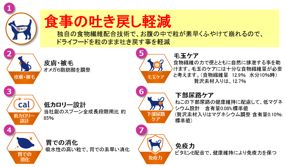 補足:「食事の吐き戻し」・・・粒が胃の中で吸水し、膨らむと猫ちゃんが吐いてしまう理由の1つとなります。 約65.4%※の猫が食事の吐き戻しを経験しています。 ※ユニ・チャーム調べ