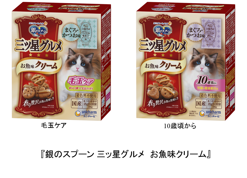 ユニ・チャーム株式会社(代表取締役 社長執行役員:高原豪久)は、 愛猫の健康や年齢に対する食意識の高まりにお応えし、『銀のスプーン三ッ星グルメ お魚味クリーム』から、「毛玉ケア」「10歳頃から」を2021年9月6日に全国で新発売します。