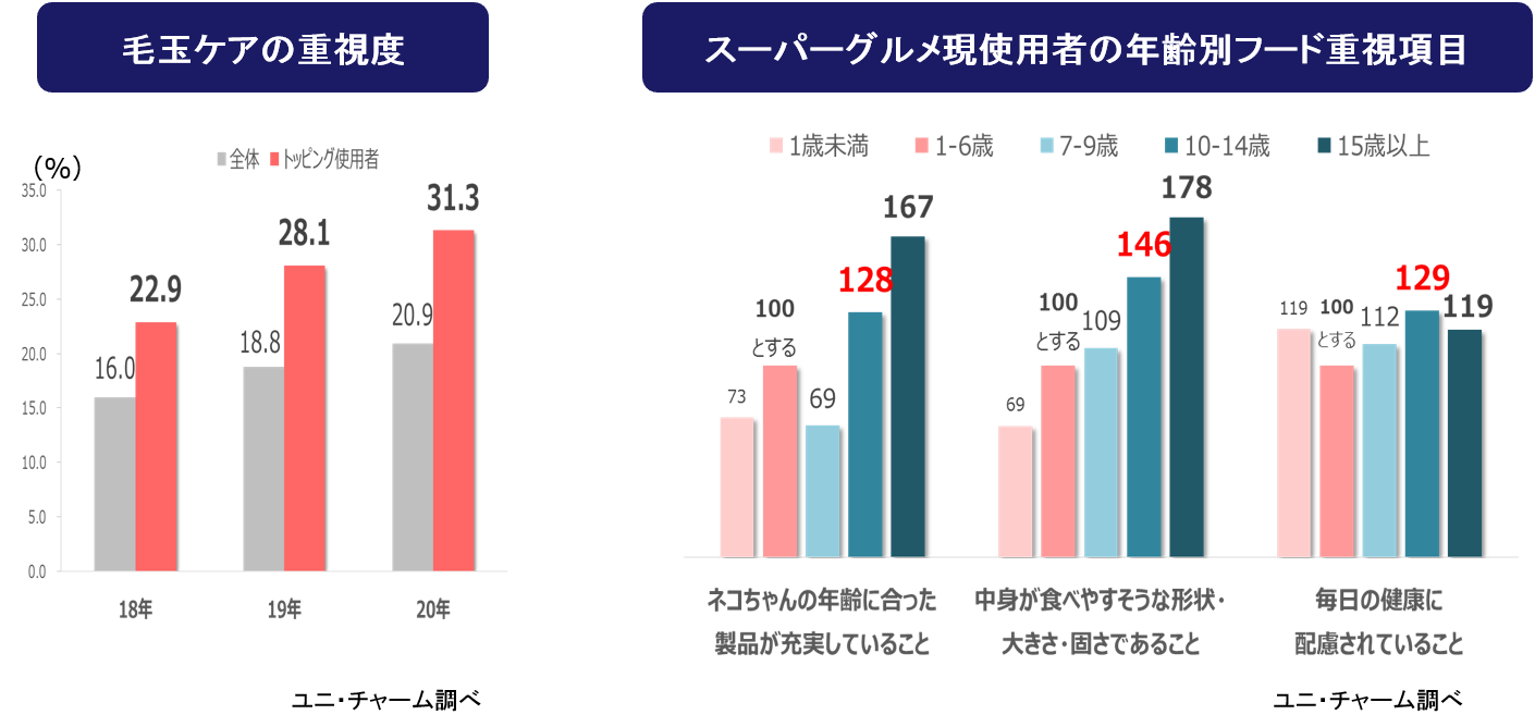 コロナ禍で愛猫と過ごす時間が長くなり、愛猫を食事で喜ばせたいという意識の高まりから、ドライフードをトッピングとして使用している方が増加しています。(コロナ前2019年:100とした場合、コロナ後2020年:108※) このような中、毛玉をケアしたい意識も年々上昇しており、特にドライフードをトッピングとして使用している方はその意識が高い傾向にあります。また、年齢別製品や健康に対する意識は10歳を境に高まることがわかりました。