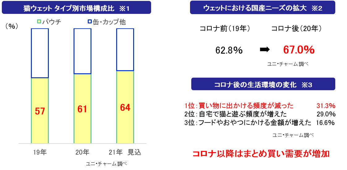 猫ウェットフード市場において、パウチタイプの構成比が年々増加※1しており、コロナ前とコロナ後の比較では、ウェットフードに対する“国産”ニーズが高まっています※2。また、コロナ以降の生活意識の変化として、まとめ買い需要が増加※3しています。