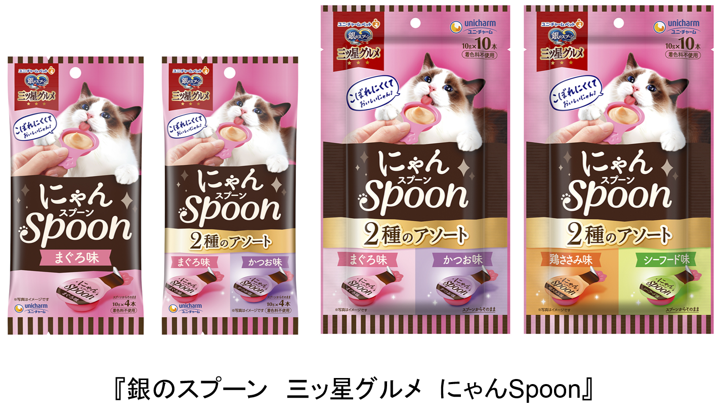 ユニ・チャーム株式会社(代表取締役 社長執行役員:高原豪久)は、ウェットおやつをネコちゃんに与えるときの様々なトラブルを解決し、ネコちゃんとのおやつの時間を楽しんでいただきたいという想いから、こぼれにくくておいしい新しいタイプのウェットおやつ『銀のスプーン 三ッ星グルメ にゃんSpoon』 を2021年11月29日に全国で新発売します。