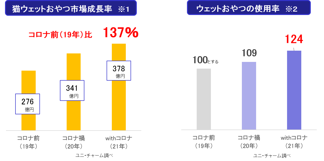 年々拡大※1している猫用のウェットおやつ市場は、新型コロナウイルス発生以降、在宅時間の長時間化、それによる愛猫とのコミュニケーションの時間の増加によって使用率も上昇※2しており、今後、更なる成長が予測されます。