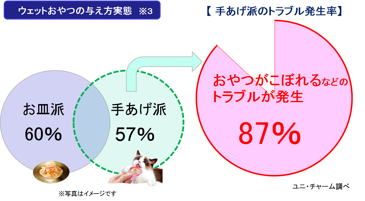 一方で、ウェットおやつの与え方を見ると、手から与える方は57%※3いらっしゃいますが、そのうち87%※3の方が、おやつがこぼれるなどのトラブルを経験しています。
