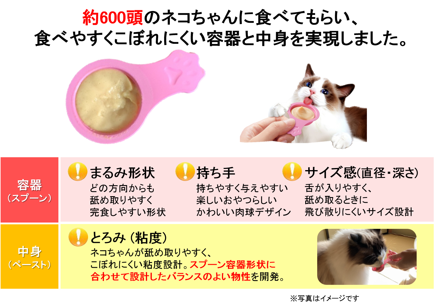 ①ネコちゃんが食べやすく、中身がこぼれにくいスプーンタイプのウェットおやつです。<特許出願中>