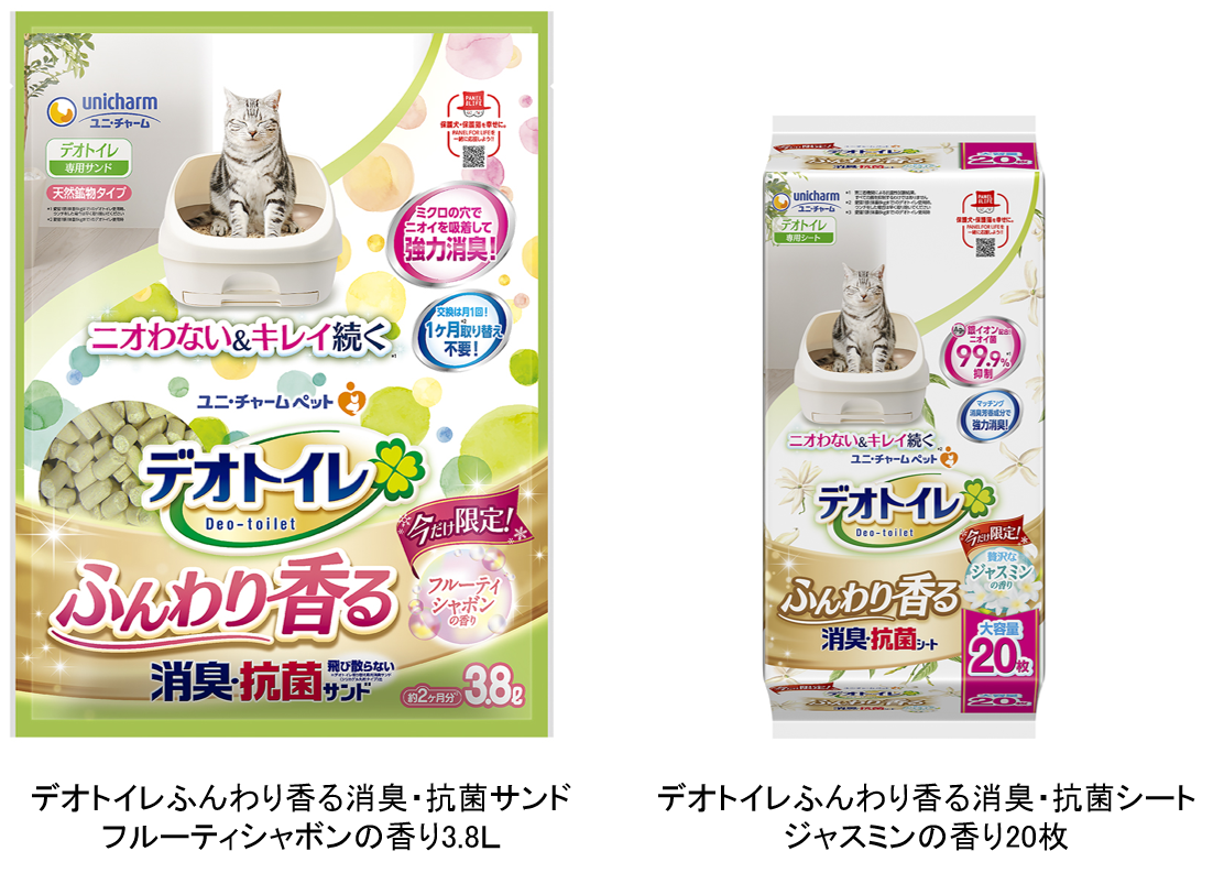 ユニ・チャーム株式会社(代表取締役 社長執行役員:高原豪久)は、 在宅時間の増加による猫用システムトイレ※取替品の“香りつき消臭ニーズの拡大”にお応えし、『デオトイレ 取替サンド』から“フルーティシャボンの香り”、『デオトイレ 取替シート』から“ジャスミンの香り”を期間限定で2021年10月18日に全国で発売します。