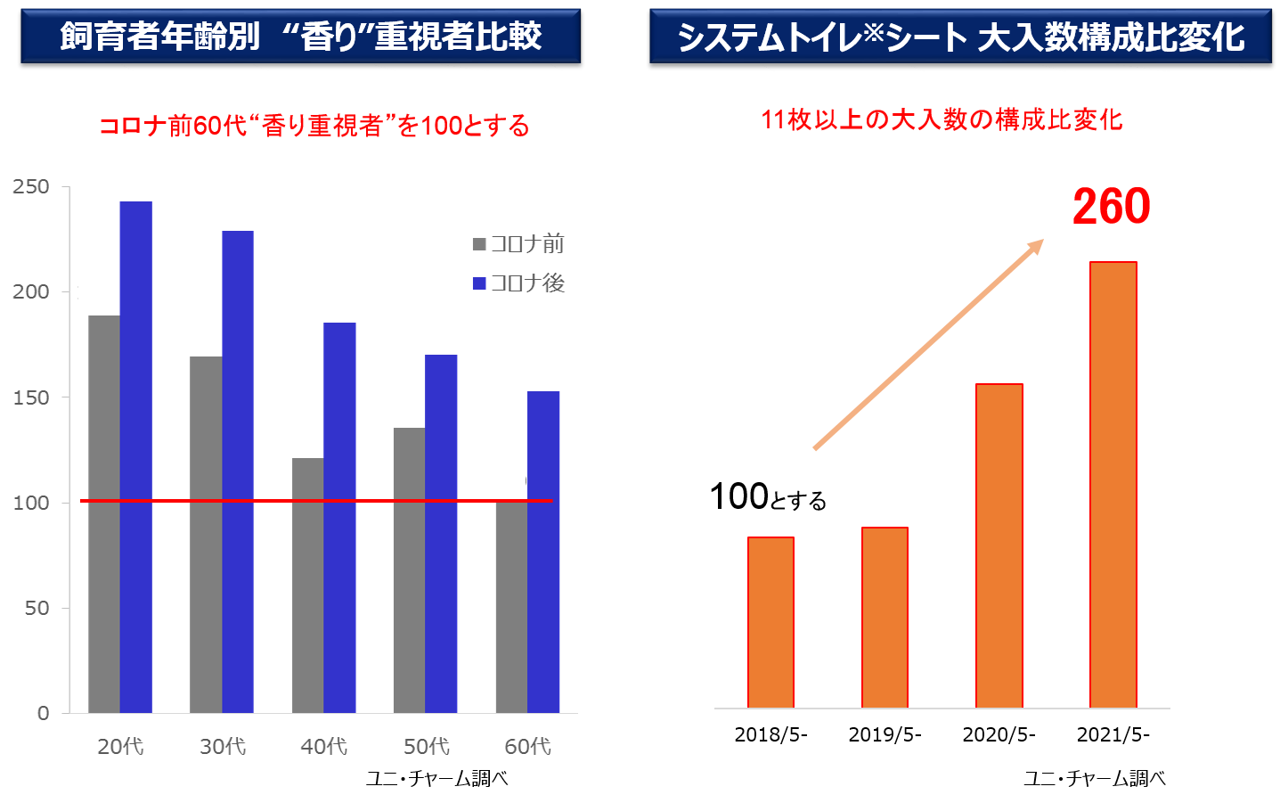 また、コロナ禍での買い物頻度の減少による“まとめ買い”ニーズが発生。システムトイレシートも11枚以上の大入りサイズがコロナ前(2018年5月)と比較し、約2.6倍拡大しています。
