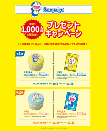 対象商品:ウェーブ対象商品 <ドラえもんパッケージ商品>税込500円以上のレシートで応募※5