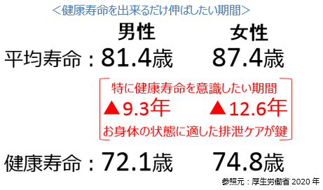 近年、私たちの平均寿命は延び続け、今では‟人生100年時代”といわれています。しかし、厚生労働省の調べによると、自立した生活を送れる期間「健康寿命」は、平均寿命より男性は約9年、女性は約12年も短いと発表されています。これは要支援や要介護になるなど、健康上の問題で日常生活に制限のある期間が平均で9~12年もあることになります。こうした期間に誰もが経験しうる排泄トラブルは、対処の方法次第でQOL(生活の質)に大きく影響します。長い人生、いつまでも元気で普段通りに過ごすためにも、適切な排泄ケアが大切です。
