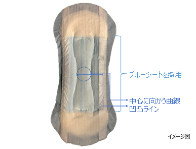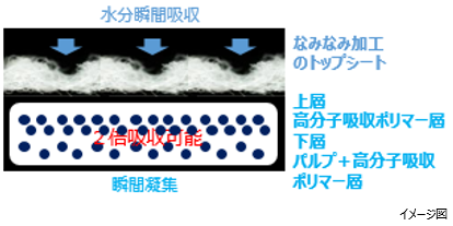 - 吸収する面積を最大化させるなみなみ加工された(トップ)シートと上層シートと下層シートの2段階吸収構造で瞬間的に閉じ込める