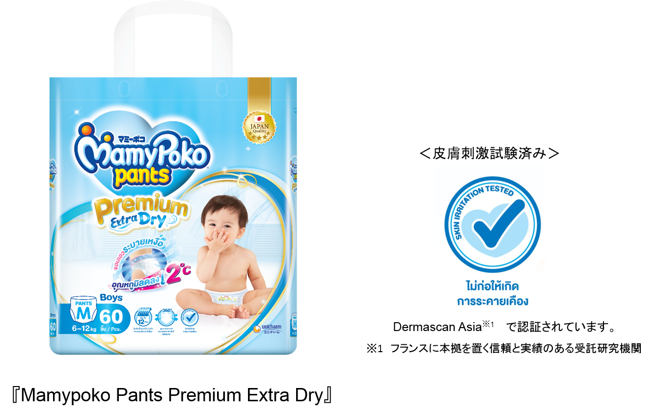 ユニ・チャーム株式会社(本社:東京都港区、代表取締役 社長執行役員 : 高原豪久)は、赤ちゃんのお肌をさらさらに保つために、紙おむつで最も汗が溜まりやすいウエスト部分に吸汗シートを搭載し、汗も外に出すことで、おむつ内温度を最大2℃※下げる「Mamypoko Pants Premium Extra Dry」を、2021年8月中旬にタイで発売しました。
