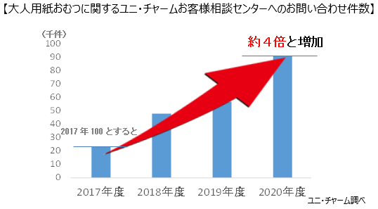 日本人の平均寿命が80歳を超えるなか、厚生労働省は「健康寿命の延伸」を掲げられています。一方で、老化に伴う筋力の衰えから、「食事・入浴・排泄」の支援や介護を必要とする高齢者は増加傾向にあります。そこで当社は、お客様相談センター(いきいきダイヤル)に加えて、2018年よりチャットボットを採用した「大人用おむつNAVI」を開設し、24時間お問い合わせ可能な環境を整えてきました。その結果、お問い合わせ件数は毎年増え続け4年間で約4倍となりましたが、そのうち約6割が紙おむつの「適切な商品」や「最適なサイズ」を調べていることがわかりました。また、大人用紙おむつの購入を目的に来店した約9割が介護者で、要介護者へ相談しないまま普段の洋服や下着のサイズを参考に紙おむつを購入し、その結果、要介護者に適さないサイズを使用している方が約4割にのぼることがわかりました。