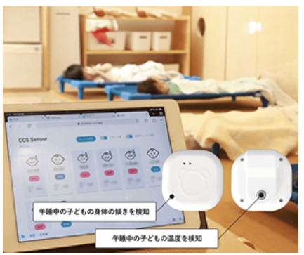 CCSセンサーは、保育施設におけるお昼寝時に、園児のおむつに装着して、体の向きを検知します。乳幼児突然死症候群(SIDS)のリスクが高いとされるうつぶせ寝を検知して保育士に知らせるほか、体の向きやお腹の皮膚温度を断続的に記録します。