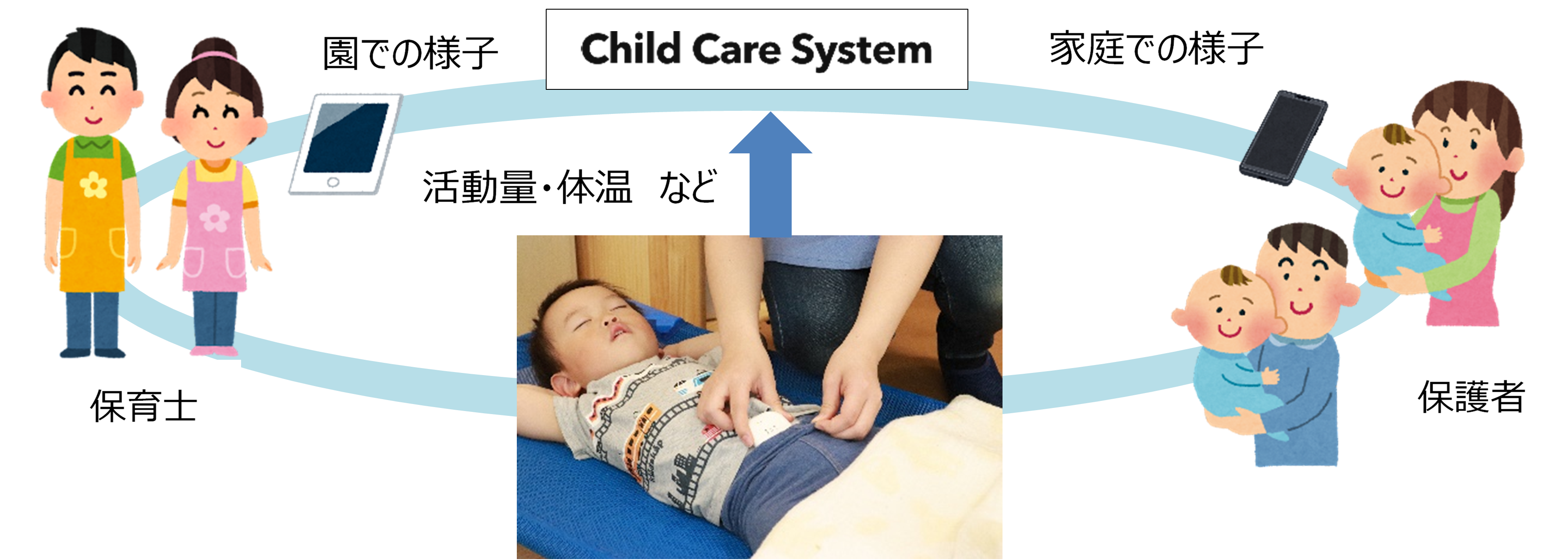 共同研究では、CHaiLDと関連のある保育園に通う0~2歳の乳幼児最大300人を対象に、睡眠中の活動量や皮膚表面温度を体動・温度センサーで測定し、日々の体調の変化を記録します。そこから得られたデータを解析することによって、家庭と保育施設が共同養育※1を行い、乳幼児にとっての良質な睡眠環境を実現し、乳幼児一人ひとりの適切な睡眠ケアへつなげます。