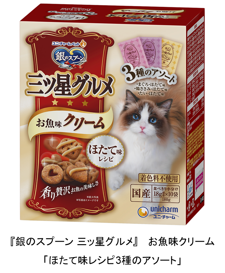 ユニ・チャーム株式会社(代表取締役 社長執行役員:高原豪久)は、ネコちゃんに「いろいろな味を食べさせたい」といったご希望にお応えして、『銀のスプーン 三ッ星グルメ』 お魚味クリーム「ほたて味レシピ3種のアソート」を、2022年3月7日に全国で発売します。