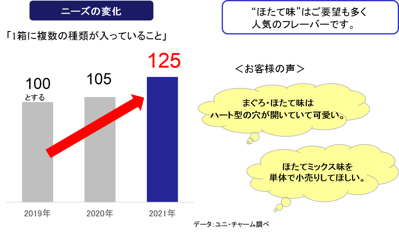 ネコちゃんを食事で喜ばせたいという意識の高まりから、味に対するこだわりも高まっています。また、「ひとつの箱に複数の味が入っているものが欲しい」といったご要望も年々増加しています。※