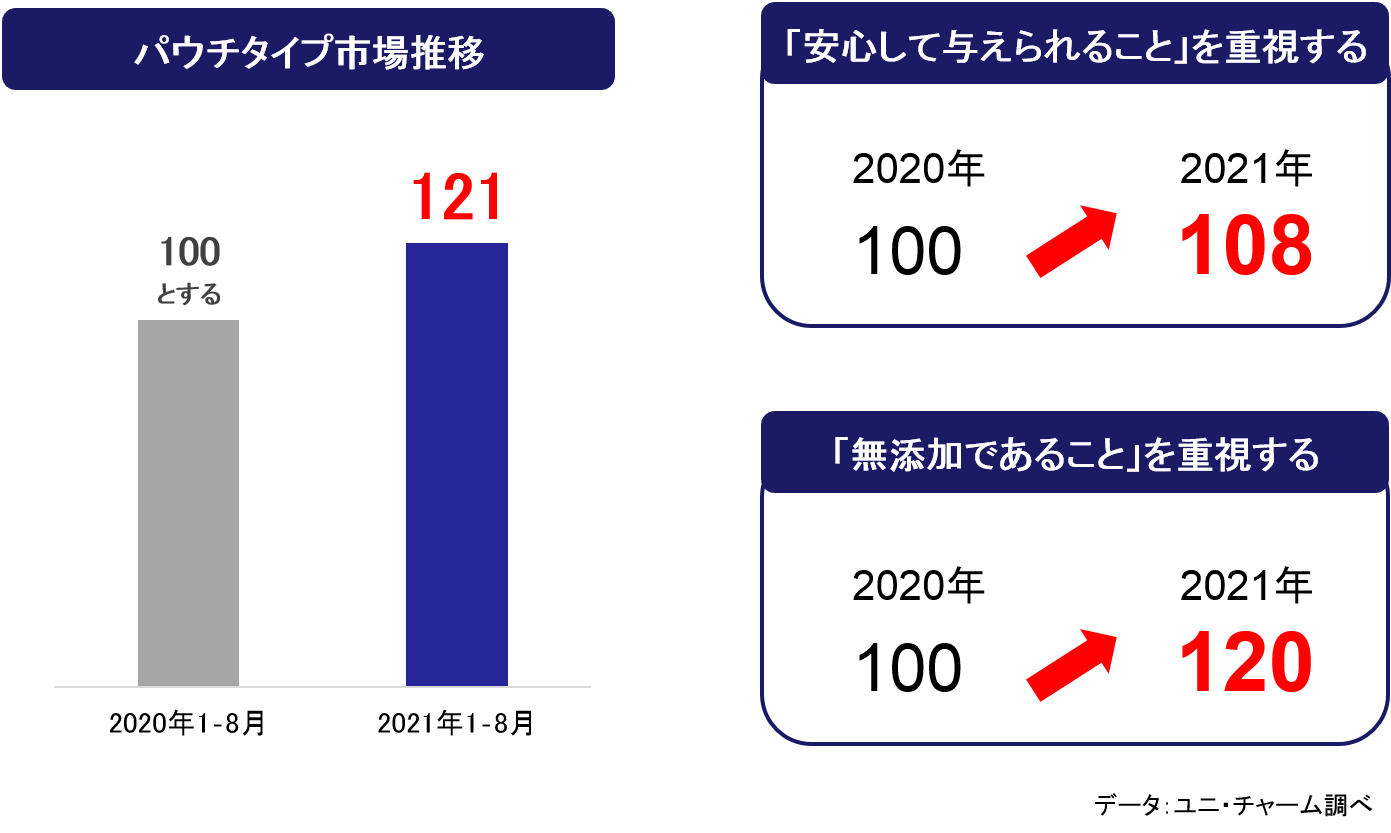 猫用ウェットフードのパウチタイプ市場は拡大しています。また、猫用フードに対しては「安全・安心」な食を求める方が増加し、特にウェットフードにおいては、「無添加」に対する重視が拡大しています。
