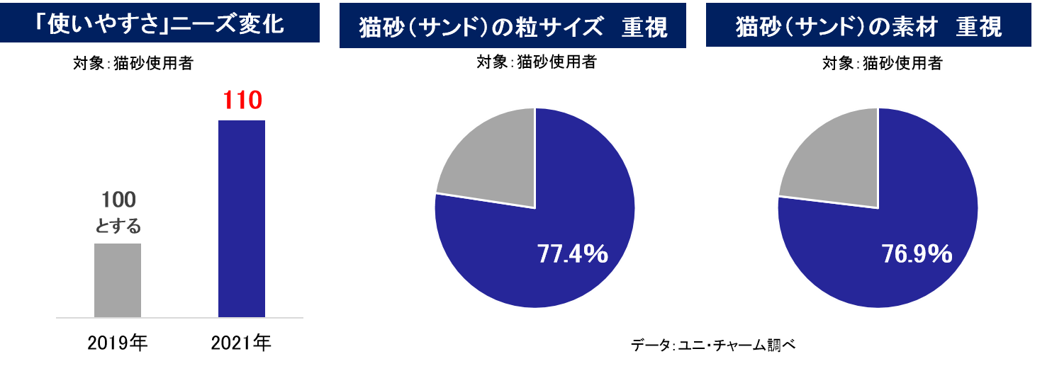 なかでも、大きなネコちゃんの飼育者は、猫砂の飛び散りの頻度も高く、トイレの大きさを重視しています。また、システムトイレは家の中で使用されるため、若年の飼育者を中心に、トイレ本体に「デザイン性」を求めています。※2