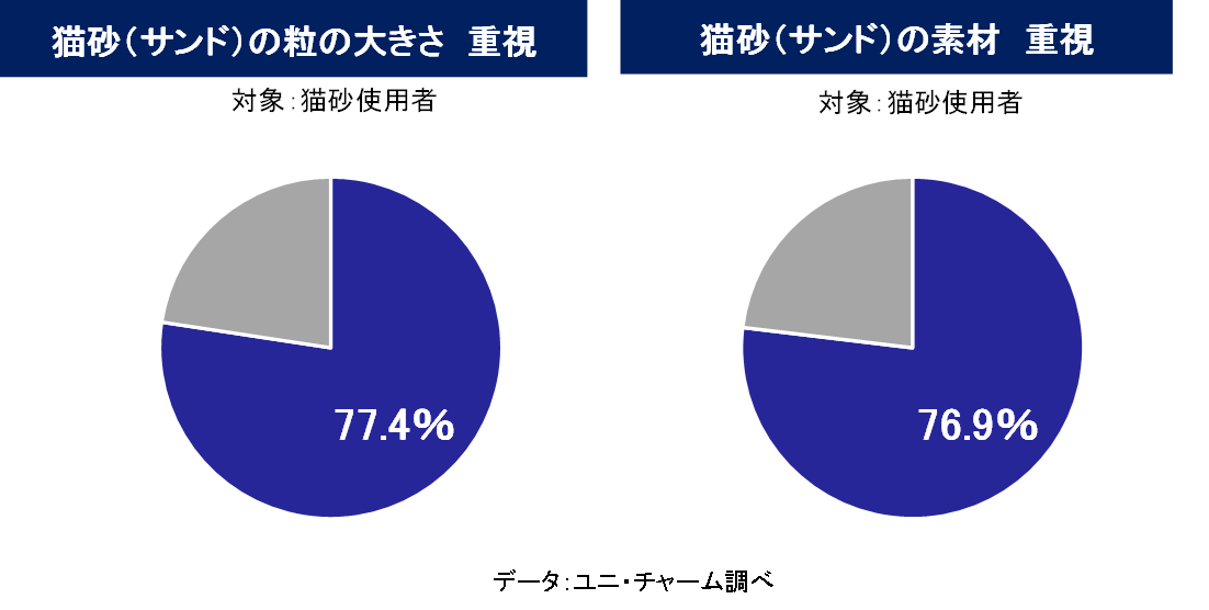 猫砂の使用者は、ネコちゃんが気持ちよく排泄できるよう、猫砂(サンド)の粒の大きさや、素材にこだわっています。また、猫砂市場の約7割は、紙や鉱物素材で構成※2されており、なかでも鉱物タイプの粒の大きさは小さい傾向にあります。