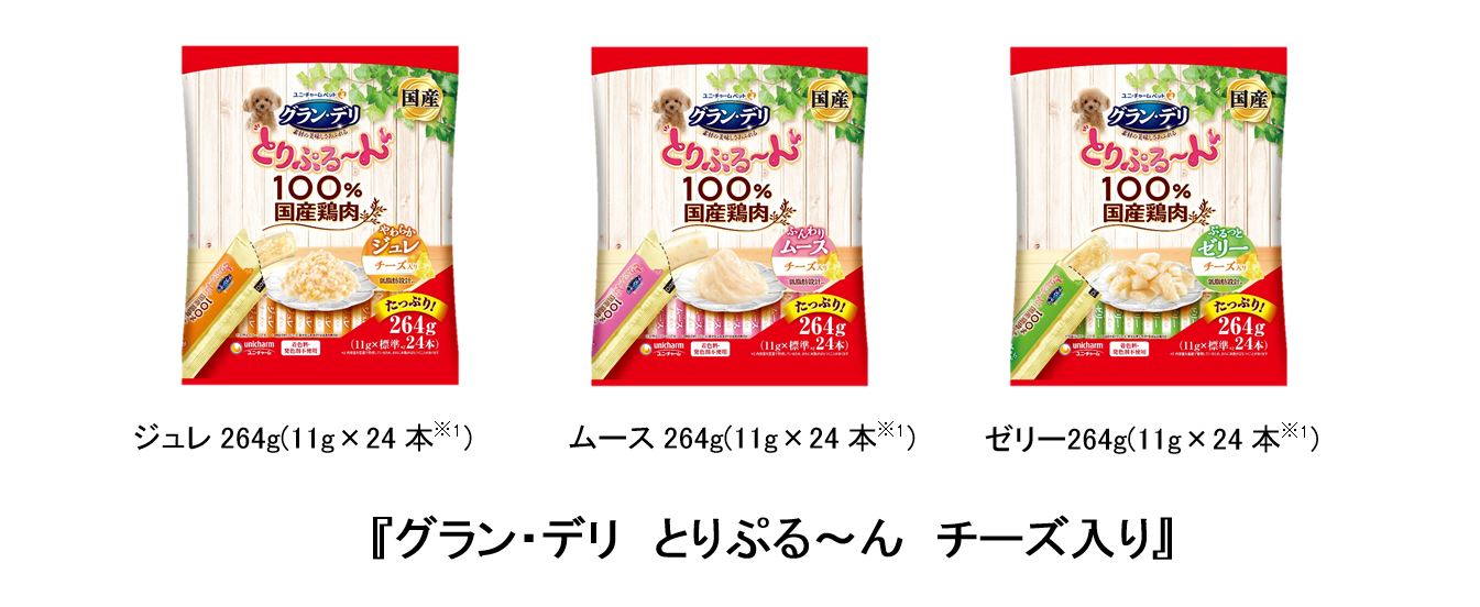 ユニ・チャーム株式会社(代表取締役 社長執行役員 : 高原豪久)は、おうち時間の増加に伴い愛犬のおやつをまとめて購入できる、100%国産鶏肉を使用した『グラン・デリ とりぷる~ん チーズ入り』大容量パックを2022年3月7日に全国で発売します。