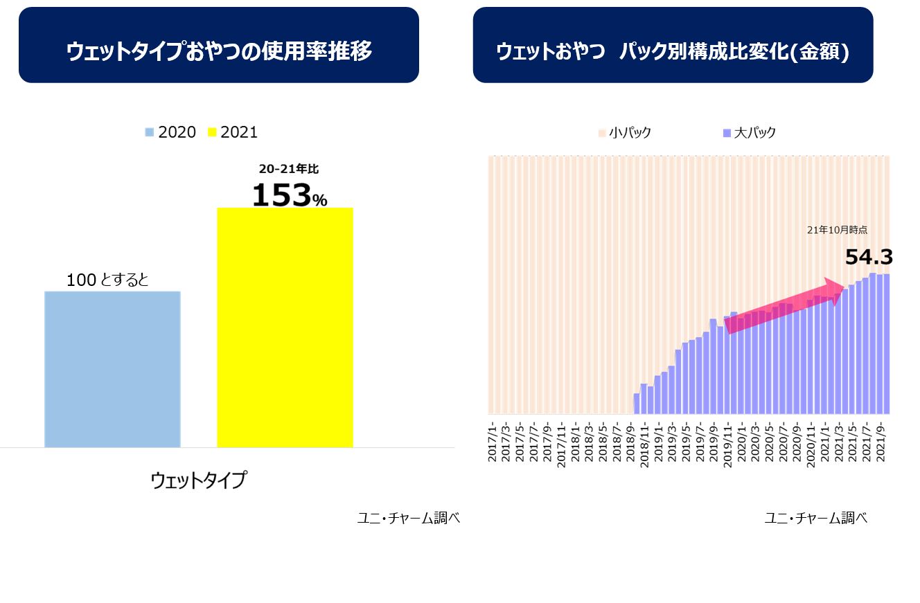 おやつ(副食)の使用率は、愛犬とのコミュニケーション手段の一つとして定着し、中でも愛犬がよく食べてくれるウェットタイプが増加しています※2。さらに、コロナ禍でのおうち時間の増加に伴い大容量パックの構成比が50%を超え拡大しています。また、飼い主様が犬用のおやつに求める最も高いニーズは「よく食べること※2」です。