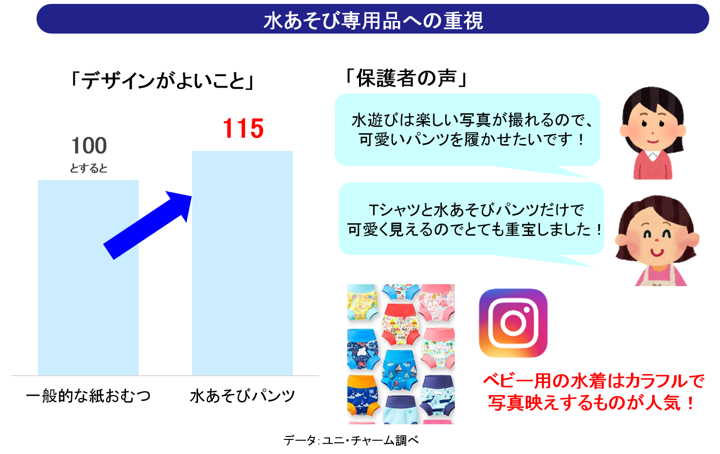 水あそびパンツは、「デザインが良いこと」を商品選択の重要なポイントに挙げられる保護者が多く、特にシャッターチャンスの多い水あそびシーンにおいては「可愛いものをはかせたい」「カラフルで写真映えするもの欲しい」といった声が多く寄せられています。