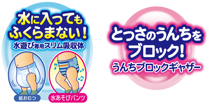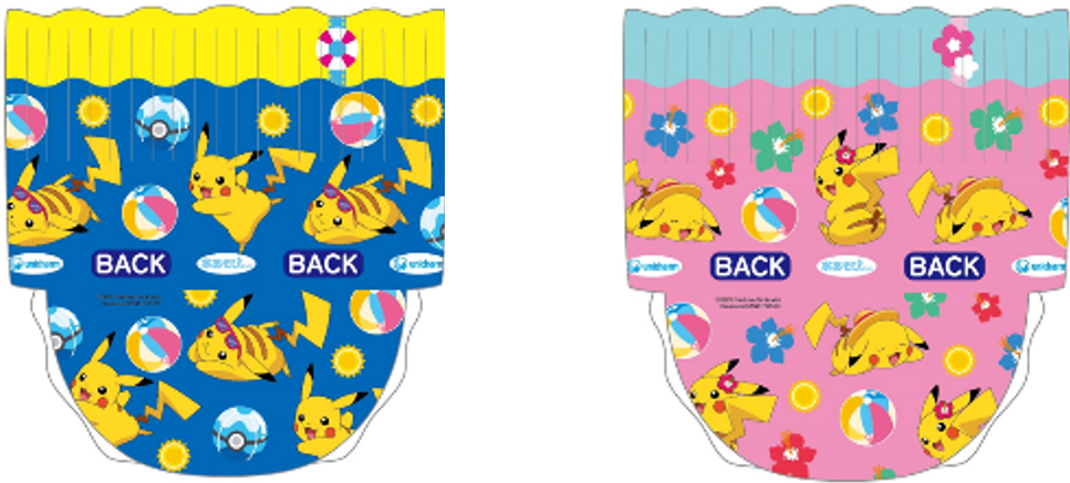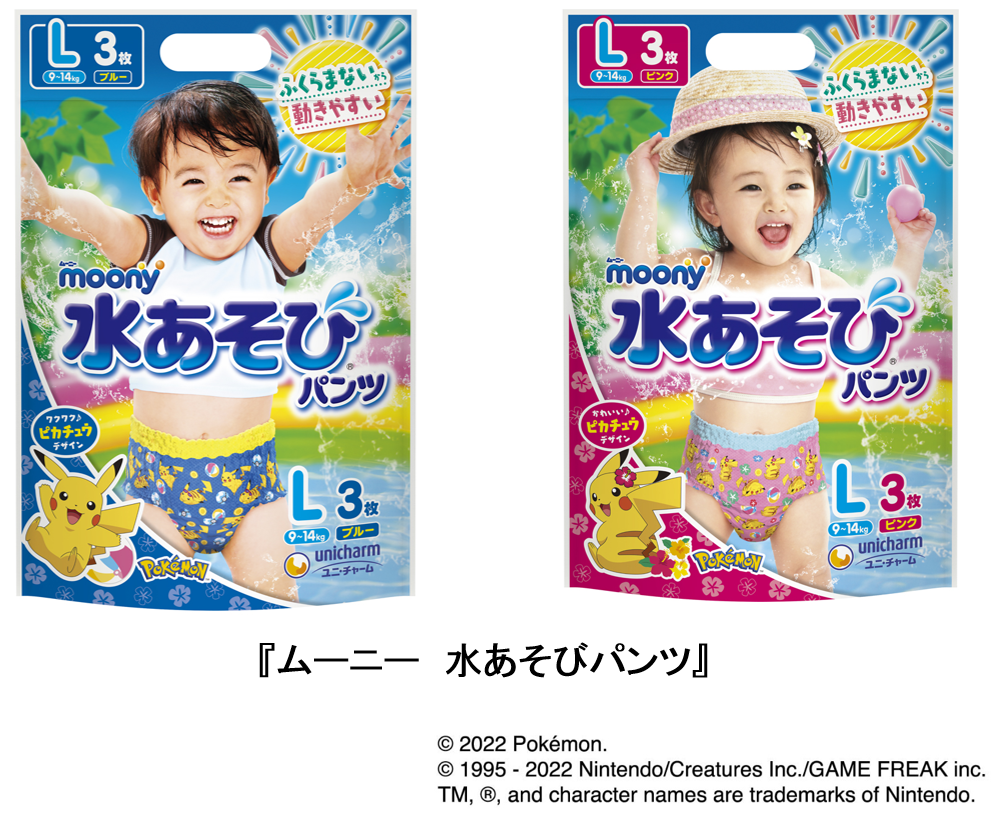 そこでこのたび、従来の「水に入ってもふくらまない」「とっさのうんちをブロックする」機能に加えて、楽しい水あそび気分を盛り上げるデザインにピカチュウを採用した『ムーニー水あそびパンツ』を、全国で発売します。