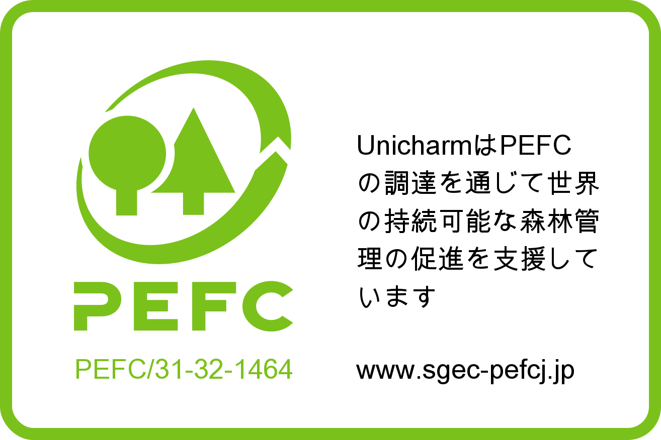 ユニ・チャーム株式会社は、当社が製造する製品の原材料の由来に関する宣言について、森林認証制度(PEFC/CoC)の要求事項を理解し、これを遵守、実施、維持するための管理規定を定め活動してまいります。
