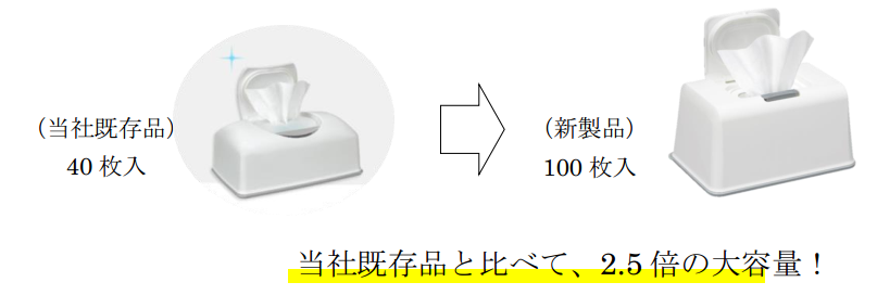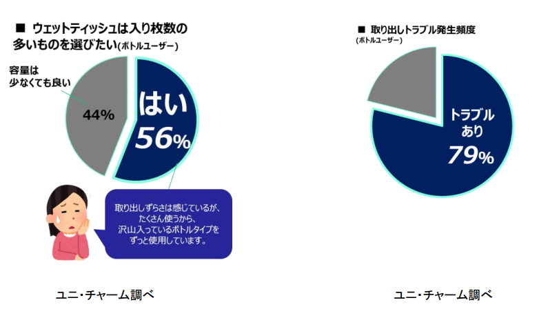 COVID-19長期化の影響などもあり、ウェットティッシュの市場規模は2019年と比較して1.3倍に拡大しています。なかでも「手軽に除菌したい」「入り枚数の多いものが欲しい」といった声をあげられる消費者が増えています。しかしながら、これまでに発売されている「除菌機能を有し、かつ大容量」の商品では「片手ではシートが取り出しにくい」や「使おうと思ったらシートが乾いている」などのトラブルが発生していることが当社の調査で分かりました。
