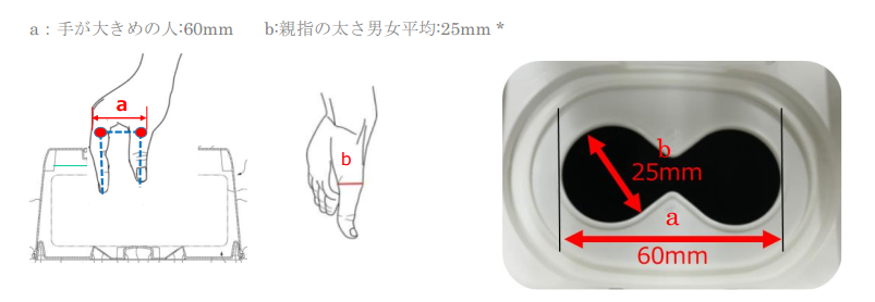 ・日本人の手指の大きさ・太さを測定したデータを元に、片手で取り出しやすい取り出し口を設計・デザインしました。