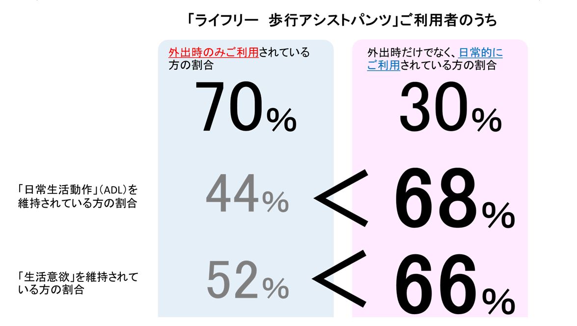 発売から2年が経過したタイミングを捉え、「歩行アシストパンツ」を継続してご使用いただいている方を調査したところ、外出時にのみ使用されている方に比べて、日常的に使用されている方は「日常生活動作(ADL:Activities of Daily Living)の維持」「生活意欲」といった心身両面の維持率が高いということが分かりました。※1