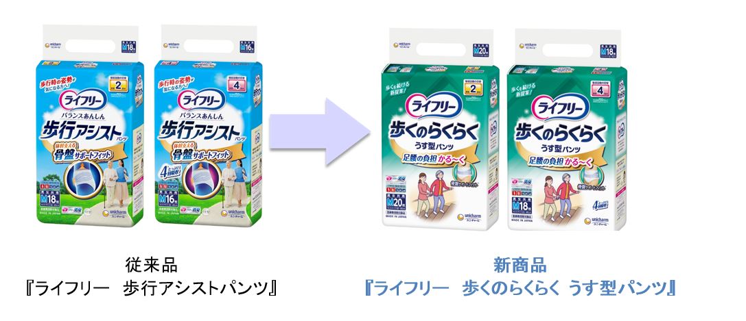 そこでこのたび、より日常的にご使用いただけるように、ご使用者から多く寄せられている満足のお声である「歩くのがらく」という商品特長をひと目でご理解いただける『ライフリー 歩くのらくらく うす型パンツ』へと名称を改め、パッケージも刷新することとしました。
