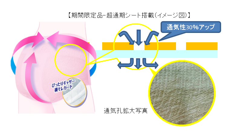 ・胴回りの不織布に「超通気シート」を搭載することによって通気性をアップしました。